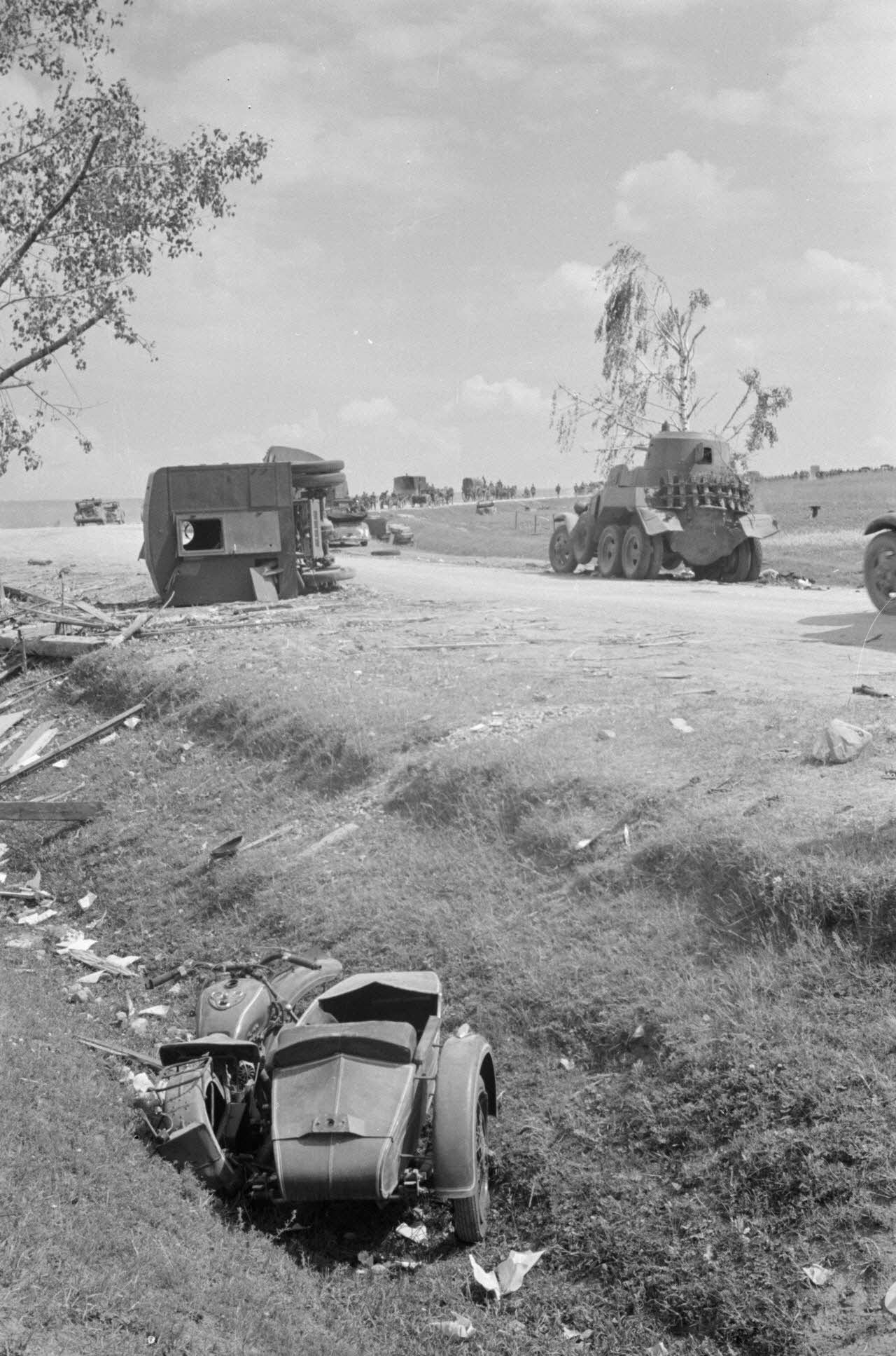 On note l'insigne de la 137. infanterie division sur les véhicules ainsi que les pavillons de reconnaissance pour l'aviation allemande (DAT 1691 L05A). Le contraste est saisissant entre les véhicules motorisés de l'armée Rouge, détruits ou abandonnés, avec les convois hippomobiles allemands.