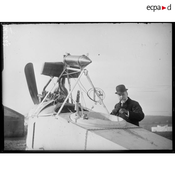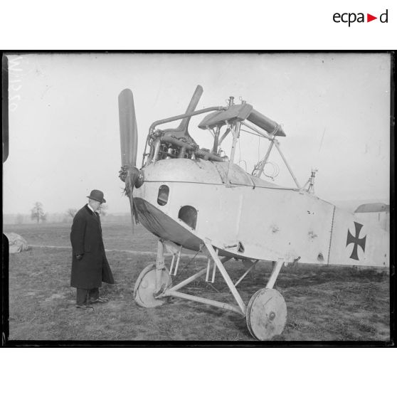 Monsieur Marchies, professeur à la faculté des sciences de Paris, examine le cockpit d'un avion de combat allemand LVG.
