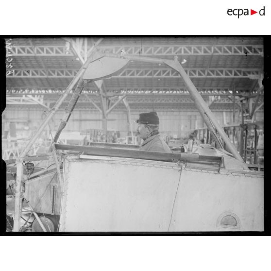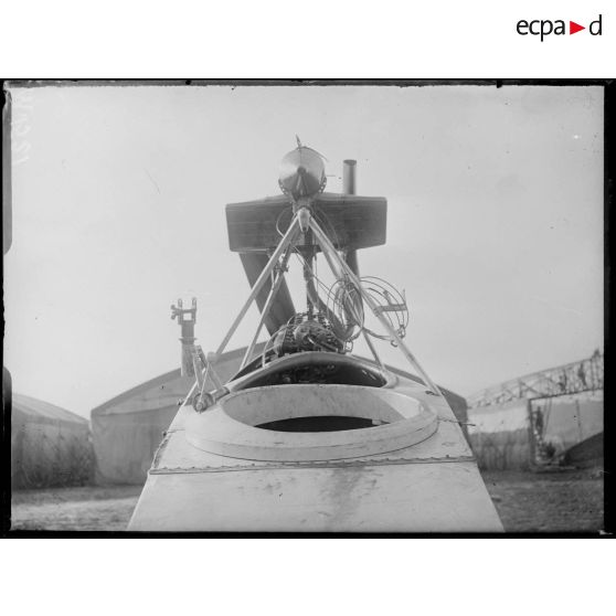 Le support de mitrailleuse d'un avion allemand de type Aviatik examiné dans les ateliers du terrain d'aviation de Saint-Cyr l'Ecole.