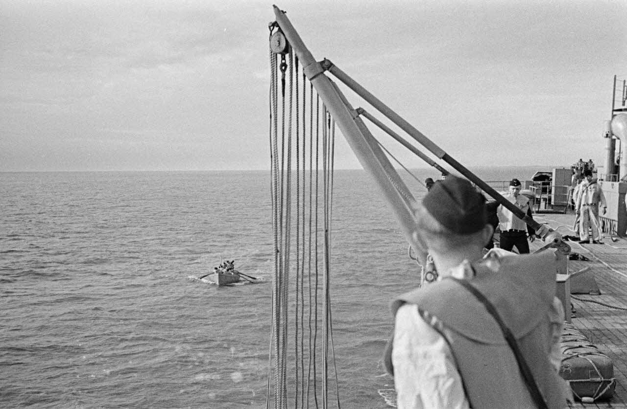 Une barque et ses passagers sont montés à bord du mouilleur de mines Ostmark.