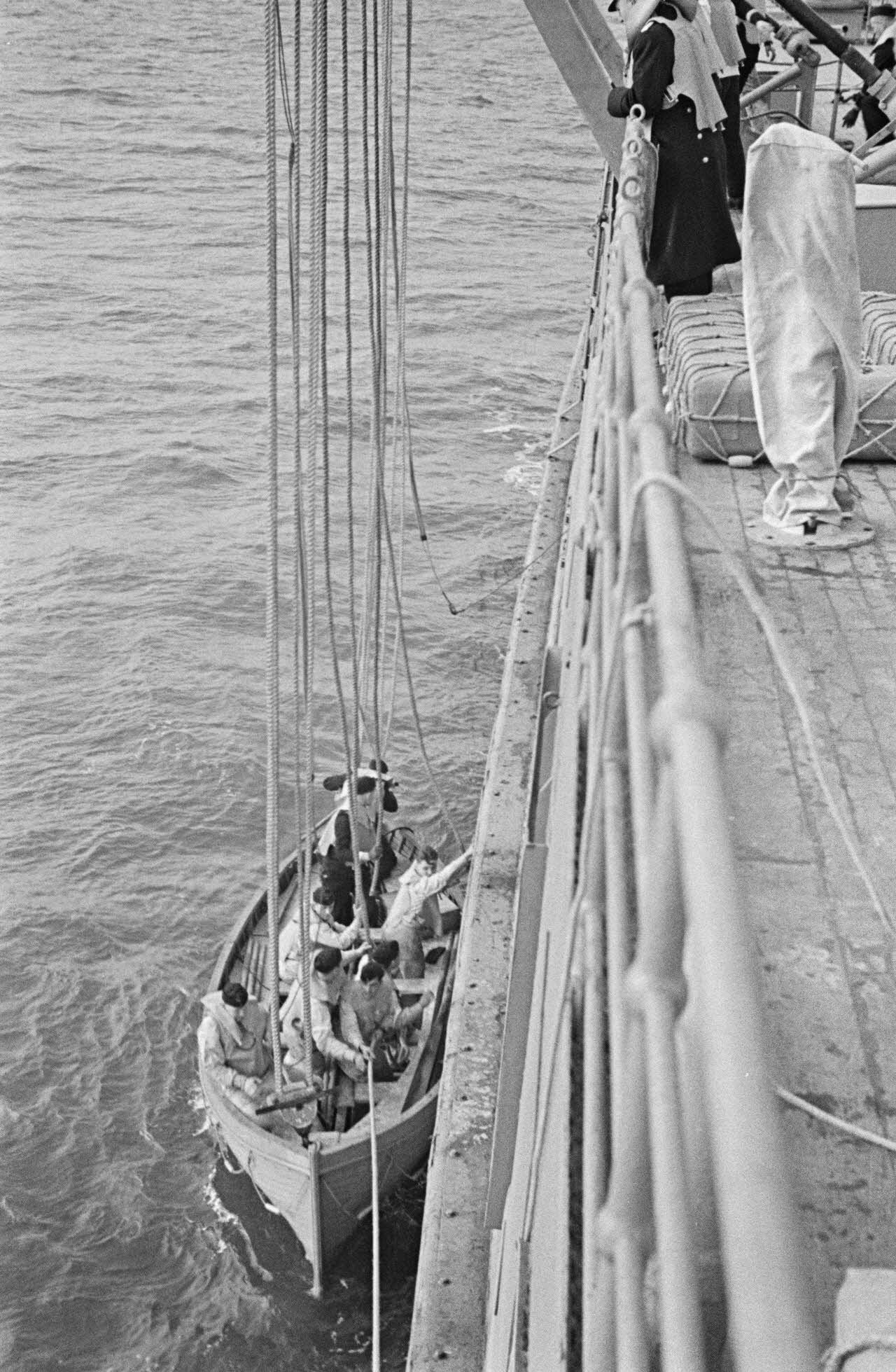 Une barque et ses passagers sont montés à bord du mouilleur de mines Ostmark.