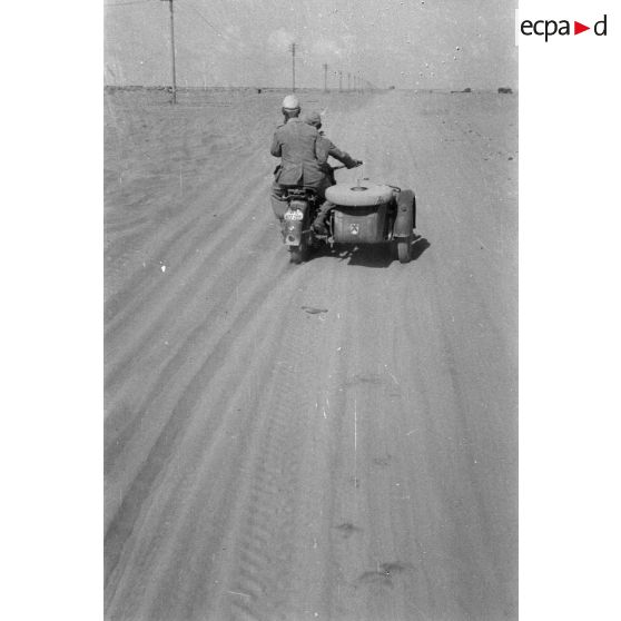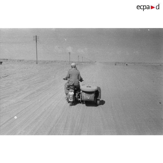 Un side-car BMW R75 roule dans le désert, le long de la piste baptisée du télégraphe.