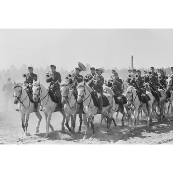 Les musiciens du 183e régiment d'artillerie de la 83e division d'infanterie allemande inaugurent le défilé face au général (Generalleutnant) Theodor Scherer, commandant l'unité d'infanterie.