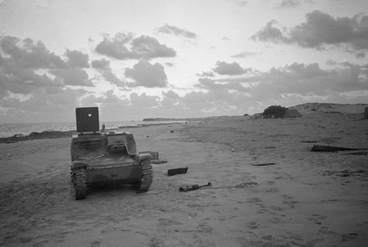 Une chenillette L3/35 ou Carro Veloce CV-35 abandonnée sur une plage.