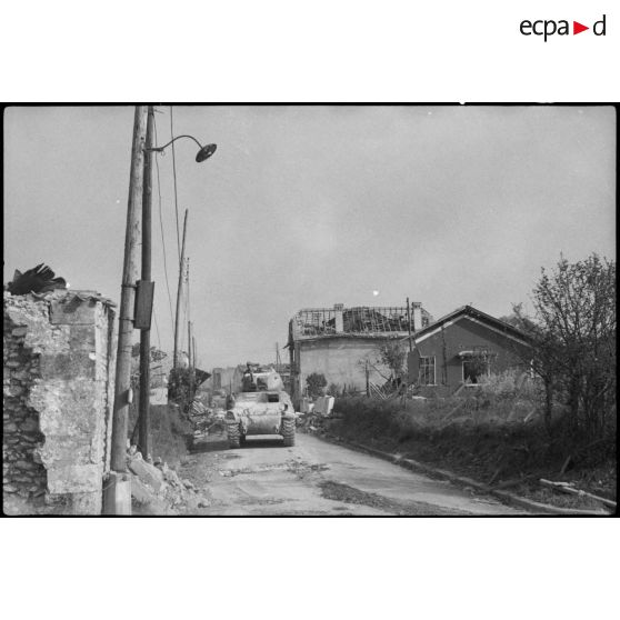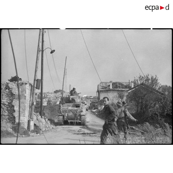 Une colonne de chars Somua S 35 du 1er escadron du 13e régiment de dragons (13e RD) progresse dans Royan.
