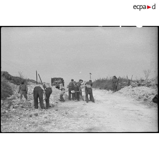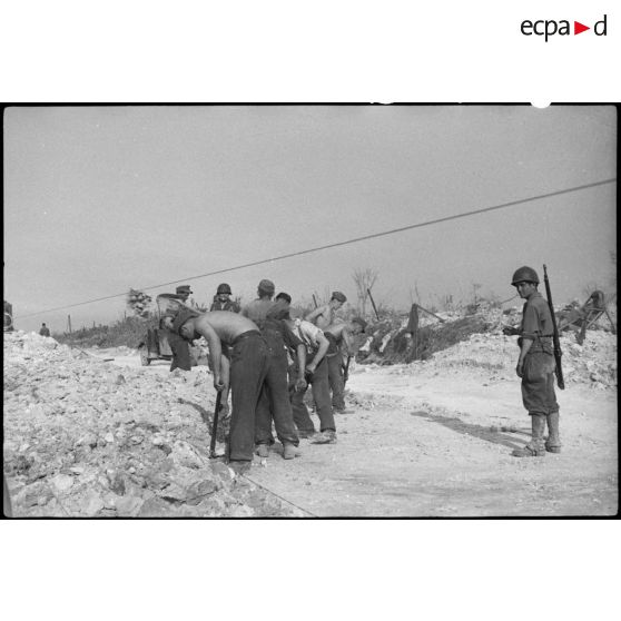 Des prisonniers allemands, sous la surveillance de troupes américaines et de résistants des Forces françaises de l'intérieur (FFI), déblaient des routes.