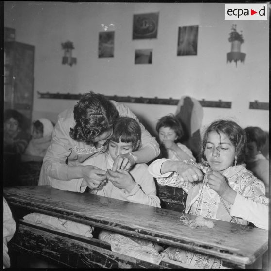 Apprentissage professionnel. Dans une salle de classe, une enseignante s'occupe de l'apprentissage du tricot auprès de ses jeunes élèves.