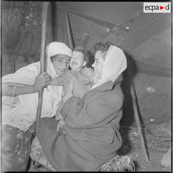 Portrait d'une membre d'une EMSI, d'une femme et d'une jeune enfant à l'intérieur d'une khaïma au cours d'une séance d'auscultation.