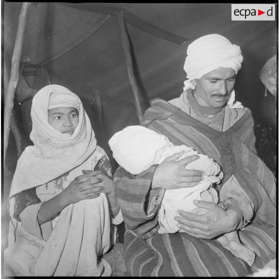 Portrait d'un homme, d'une femme et de leur bébé à l'intérieur d'une khaïma. Ils attendent leur tour pour faire ausculter leur enfant.