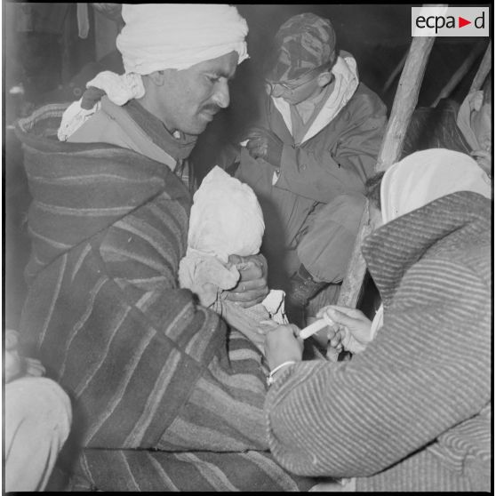 A l'intérieur d'une khaïma, une jeune EMSI effectue un vaccin sur un bébé. En arrière-plan, un jeune médecin militaire est également à l'œuvre.