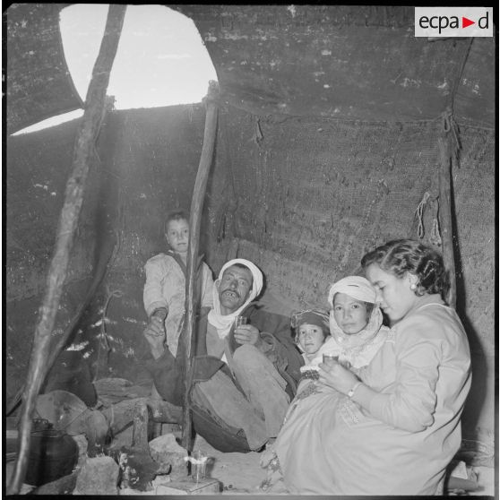 Portrait d'une famille à l'intérieur d'une khaïma. Sur la droite, une infirmière (EMSI) venue pour une séance d'auscultation boit le thé.