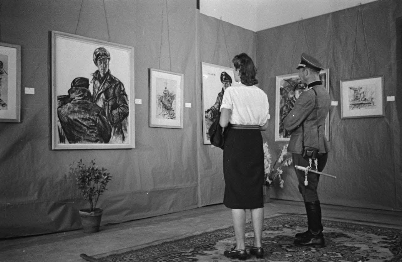 Une femme et un officier de la Wehrmacht visitent l'exposition consacrée aux peintures de Lothar-Günther Buchheim et de Richard Schreiber à l'hôtel Royal de La Baule.