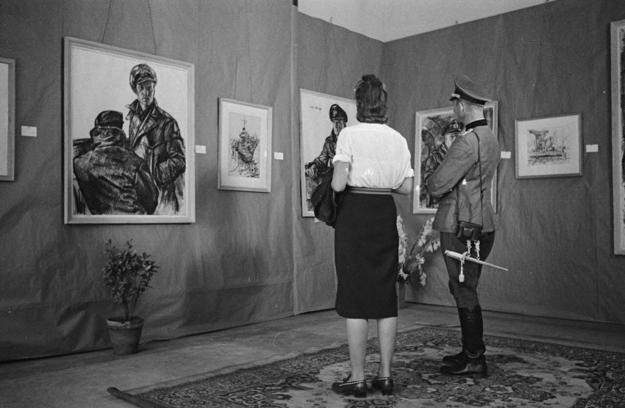 Une femme et un officier de la Wehrmacht visitent l'exposition consacrée aux peintures de Lothar-Günther Buchheim et de Richard Schreiber à l'hôtel Royal de La Baule.
