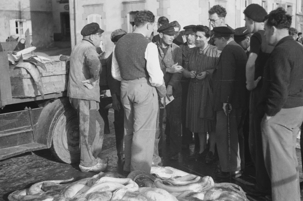 Une femme interroge les pêcheurs peu après le déchargement des poissons sur le port de Douarnenez.