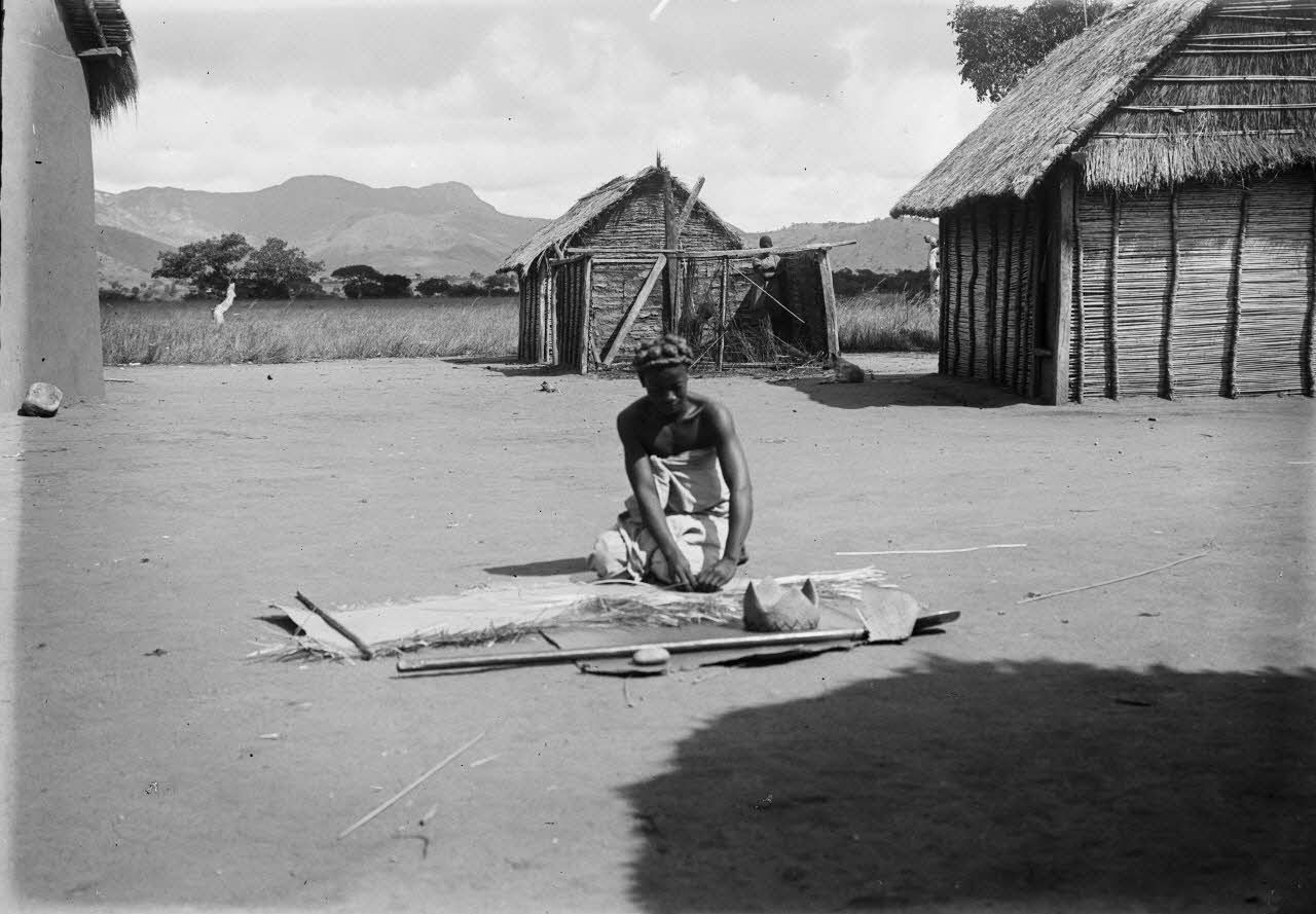 [Une femme malgache tissant sur la place d'un village.]
