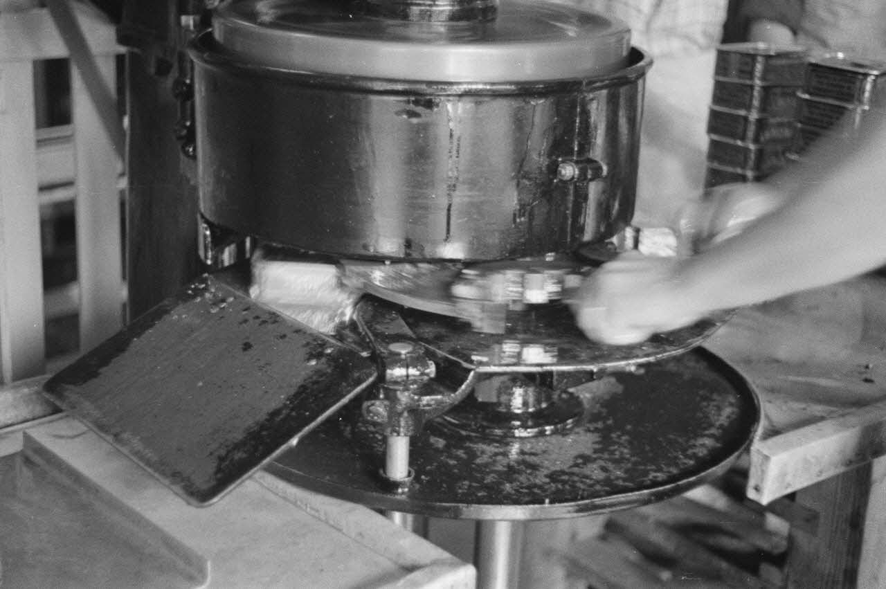 Une machine-outil pour le cerclage des boîtes de conserve, au sein de la fabrique de sardines de Douarnenez.