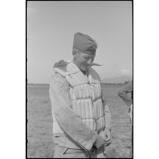 Sur l'aérodrome de Lézignan-Corbières, un membre du Sondergruppe du Luftlandegeschwader 1 (groupe aéroporté) s'équipant d'un gilet de sauvetage.
