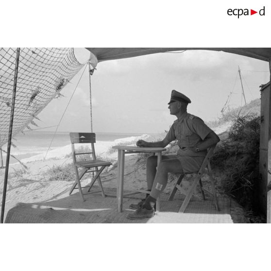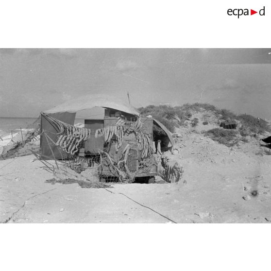 Un camion Opel Blitz est camouflé dans le sable près de la côte.