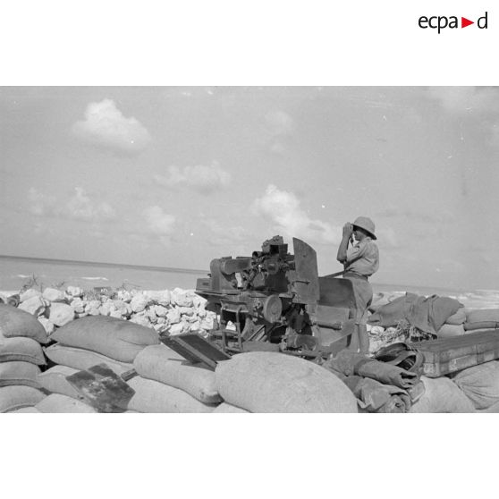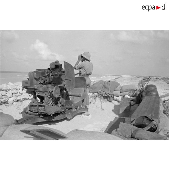 Alvéole d'un canon FlaK-38 de 2 cm, un des servants scrutant la mer avec des jumelles.