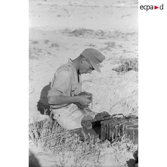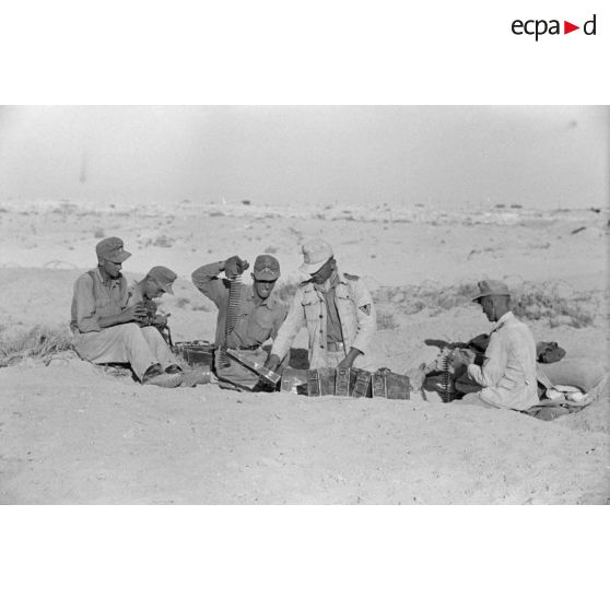 Chargement des munitions pour une mitrailleuse MG-34 au sein d'une position défensive allemande.