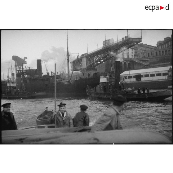 Dans le port de Brest, armement du chalutier Capitaine Armand, réquisitionné par la Marine nationale comme patrouilleur auxiliaire, au sein de la 4e escadrille de patrouilleurs auxiliaires (EPA) de la 2e région maritime (RM).