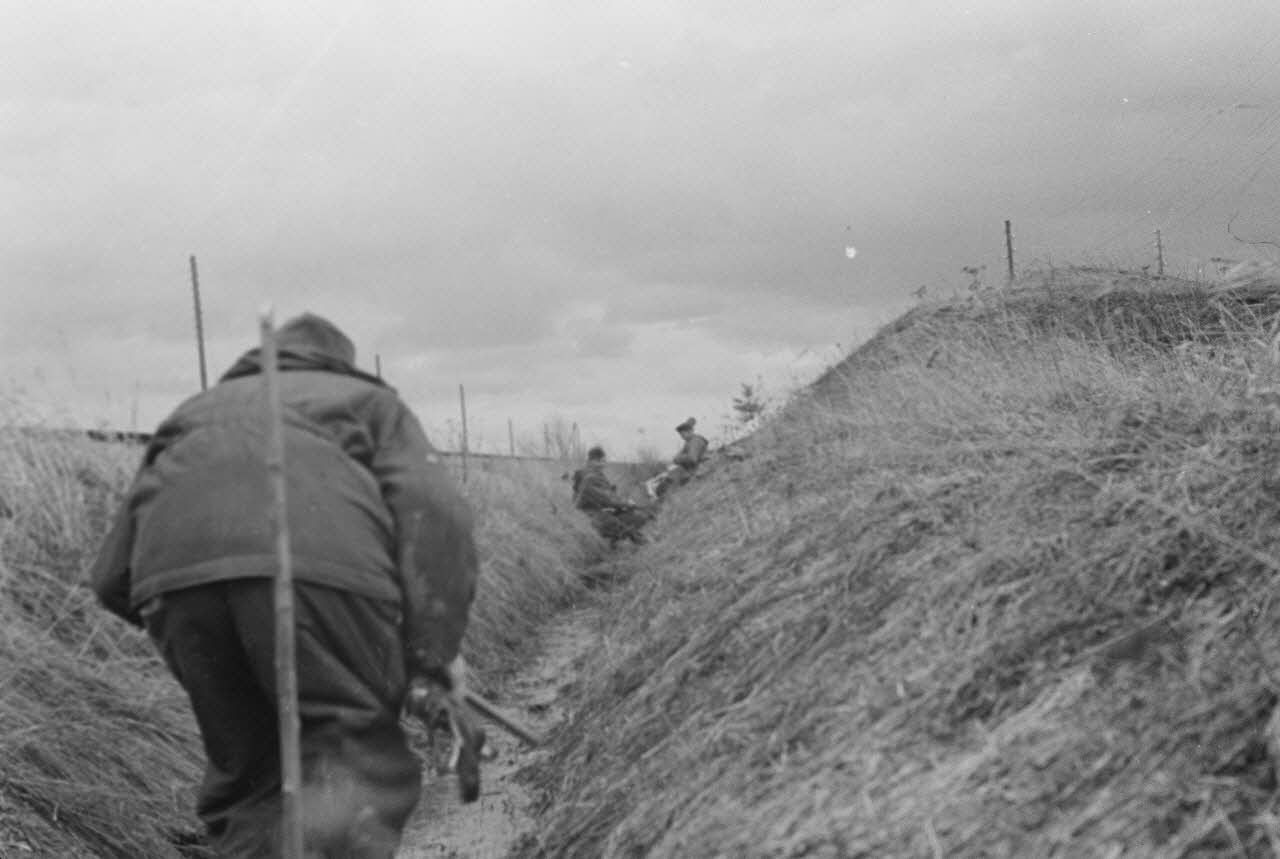 Lors d'une patrouille, des fantassins allemands qui viennent de traverser une rivière doivent changer de chaussettes.
