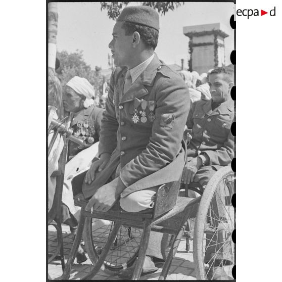 Un ancien combattant, mutilé de guerre, qui assiste à une cérémonie à Mouzaïaville.