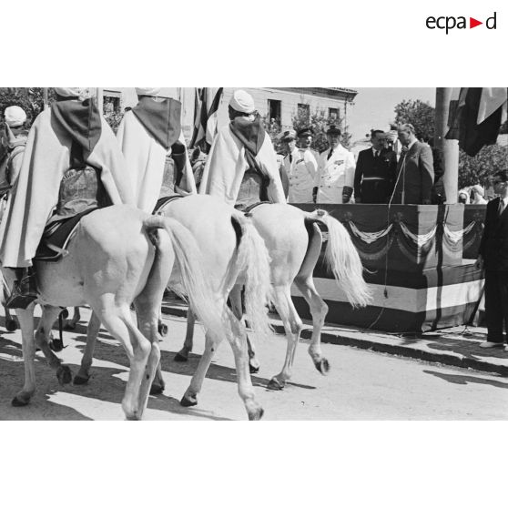 Le général Guy Schlesser défile à cheval lors d'une cérémonie militaire à Mouzaïaville.