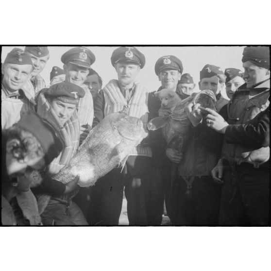 Des marins allemands de la 12. Räumbootflottille présentent le résultat de la pêche.