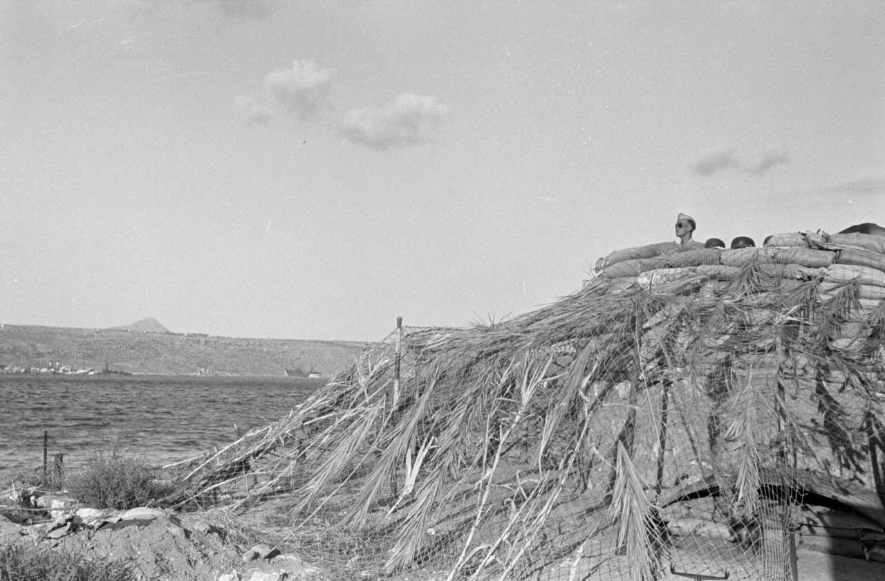 La baie de La Sude (Souda), les habitants travaillent dans le port comme docker ou comme pêcheur (légende d'origine). Une pièce de DCA de 2 cm protège la baie de la Souda.