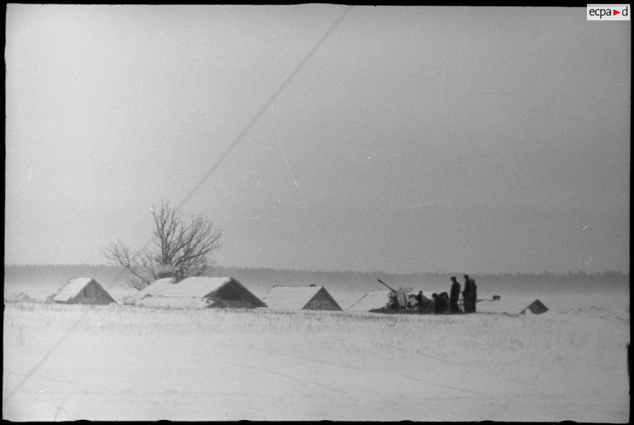 Des traîneaux transportent plus rapidement le ravitaillement que les véhicules qui souffrent du froid. Une colonne de semi-chenillés progresse péniblement dans le neige, la traversée d'un pont semble encore plus difficile. Posté derrière une isba, un Nashorn (Sd.kfz.164) armé d'un canon de 8,8 cm Pak 41/43 stoppe les incursions de l'armée Rouge. Deux portraits du lieutenant Albert Ernst, chef de section au sein du 1er escadron du schwere Panzerjäger-Abteilung 519 (PK697 F951 L36 et L37).