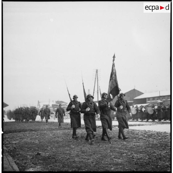 Défilé et prise d'armes de soldats de la 7e armée, dans la neige, devant des officiers généraux Giraud (le deuxième à partir de la gauche), commandant la 7e amée, et le général Georges commandant en chef du théatre d'opérations du Nord-Est, au centre, venu rendre visite à la 7e armée. Les soldats sont en tenue de cérémonie et portent leur drapeau : ils sont accompagnés d'une fanfare.