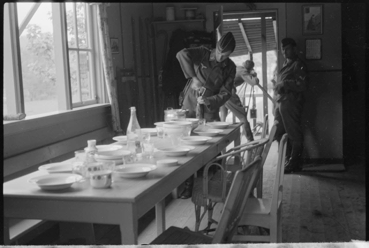 Traite d'une vache par des membres de la même compagnie de propagande, on reconnaît notamment le caméraman Hans Theyer. Le reporter porte le grade de Sonderführer (G pour Gruppenführer), grade équivalent à sous-officier. Convois allemands sur une route de Belgique.