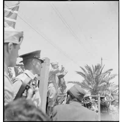 Depuis la tribune officielle, les autorités militaires, dont le général d'armée Henri Giraud, commandant en chef civil et militaire, assistent au défilé célébrant la victoire alliée à l'issue de la campagne de Tunisie.