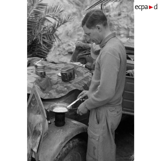 Préparation d'un repas sur une voiture Volkswagen Kübelwagen.