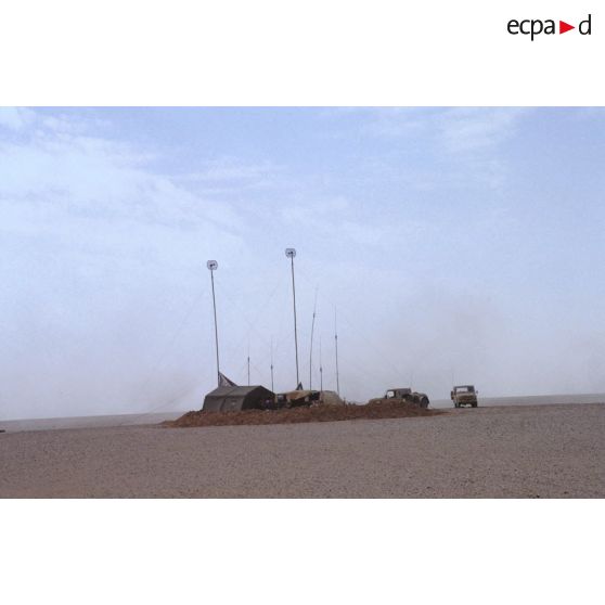 Un relais transmissions dans le désert avec des antennes paraboliques de FHM gamme 3 (faisceaux hertziens modulaires).