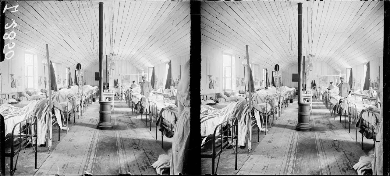 - à Vadelaincourt, l'intérieur de l'infirmerie des Dames Françaises de Montévidéo (les malades alités entourés des infirmières, de médecins, SPA 60 L 2849/2850), le personnel de l'infirmerie devant une des baraques avec un malade (SPA 60 L 2852/2853) ;