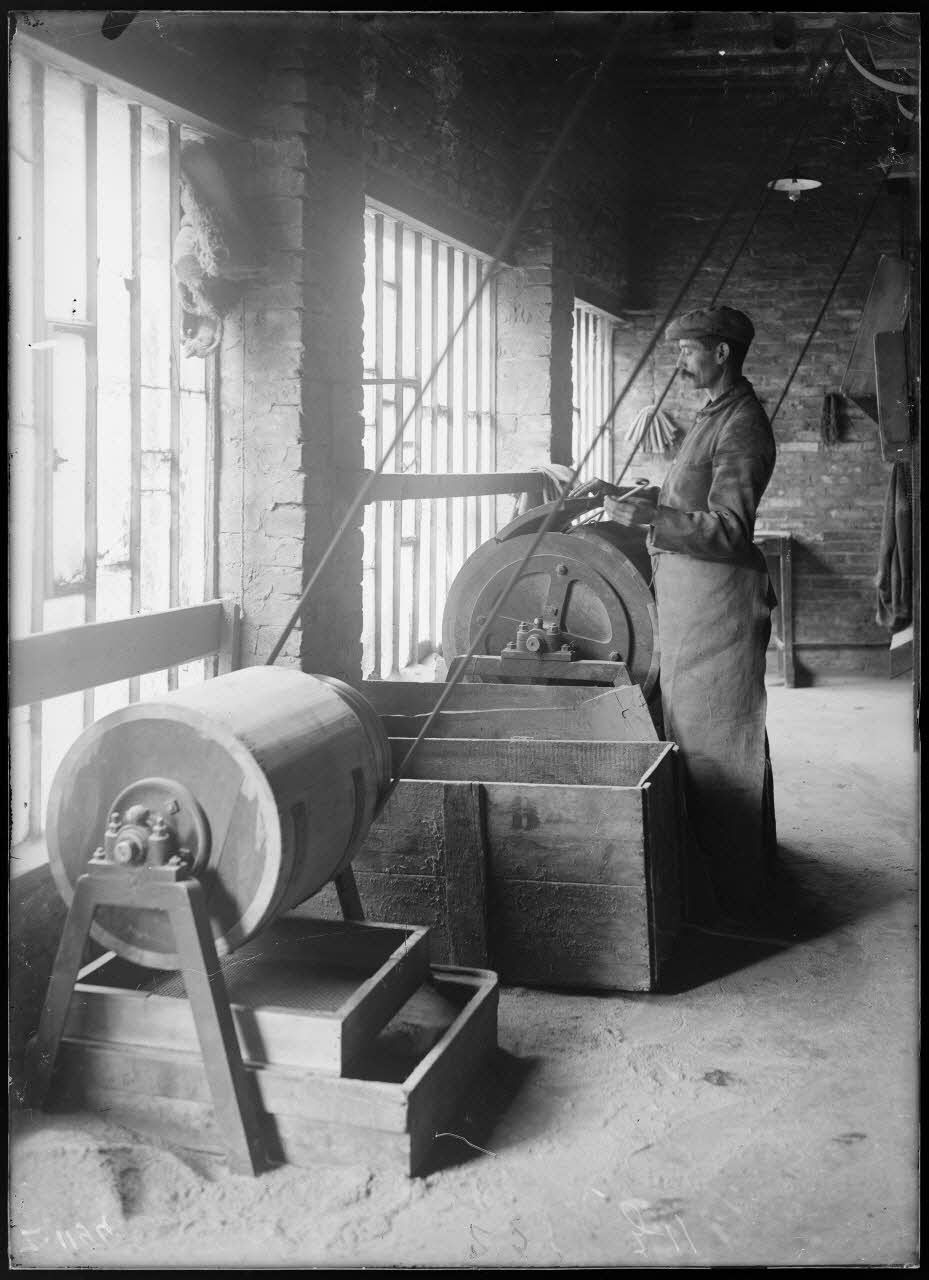 Valence. Usine Albert. Fabrication de l’amorce à collerette. Dégraissage du tambour. [légende d’origine]