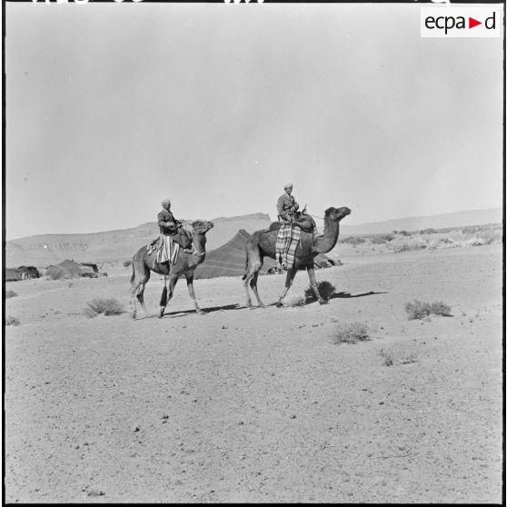 Vallée de la Zousfana. Des harkis de la 6e batterie du 2/1er RAMa (1er régiment d'artillerie de marine), avec leurs dromadaires.