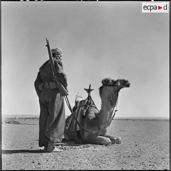 Vallée de la Zousfana. Portrait d'un harki de la 6e batterie du 2/1er RAMa (1er régiment d'artillerie de marine), avec son dromadaire.