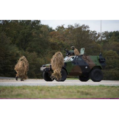 Hommes camouflés du 13e RDP (régiment de dragons parachutistes) autour d'un PVP (petit véhicule protégé) du 54e RTrs (régiment de transmissions) lors de la présentation des savoir-faire de l'armée de Terre à Satory.