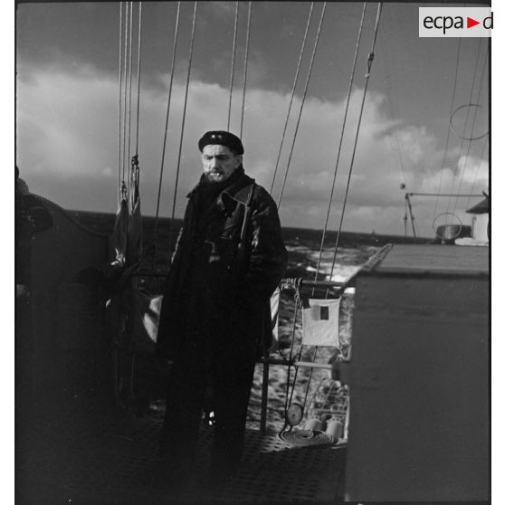 Portrait en pied du contre-amiral Emile Lacroix, commandant la 2e escadre légère de contre-torpilleurs qui assure l'escorte d'un convoi.