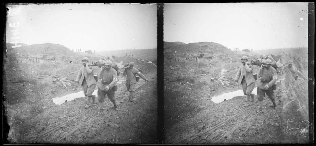 Verdun, cote 375, brancardiers emportant un blessé. [légende d'origine]
