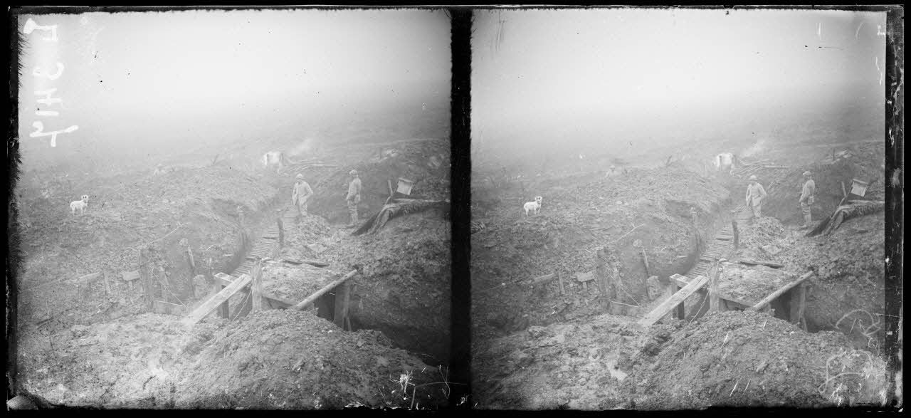 - devant Verdun, sur la cote 375, un groupe de trois soldats se déplace dans un boyau, (SPA 71 L 3411/3413) ;