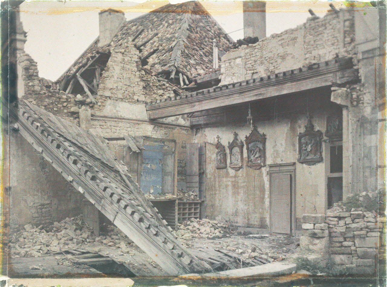 - les ruines et destructions occasionnées par la guerre à Verdun, Reims, Arras ou ailleurs : maisons, églises, cathédrales, lieux symboliques des grandes villes de province en ruines ;
