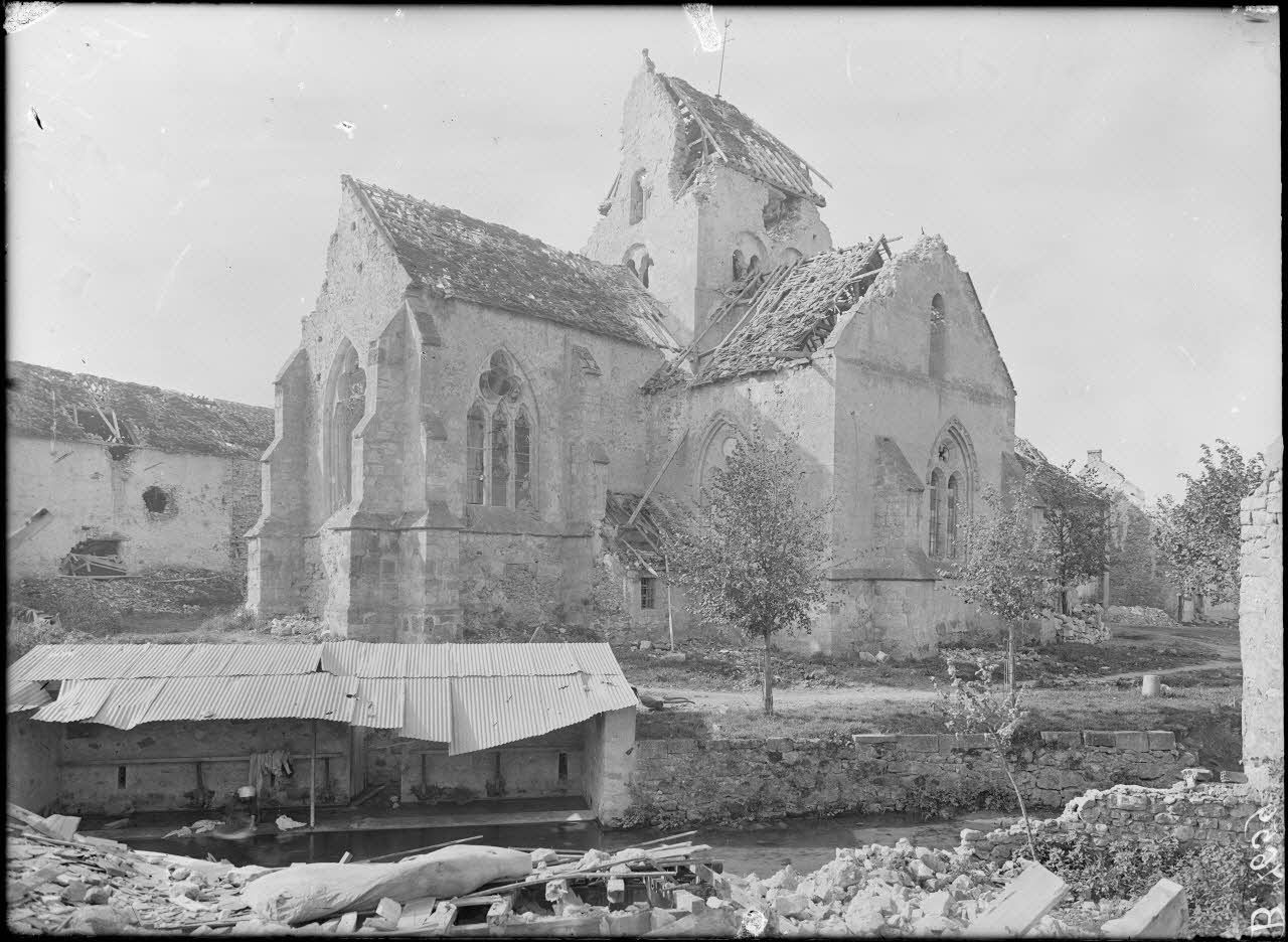 Ville-en-Tardenois (Marne). Côté sud de l'église. Une rue en ruines.