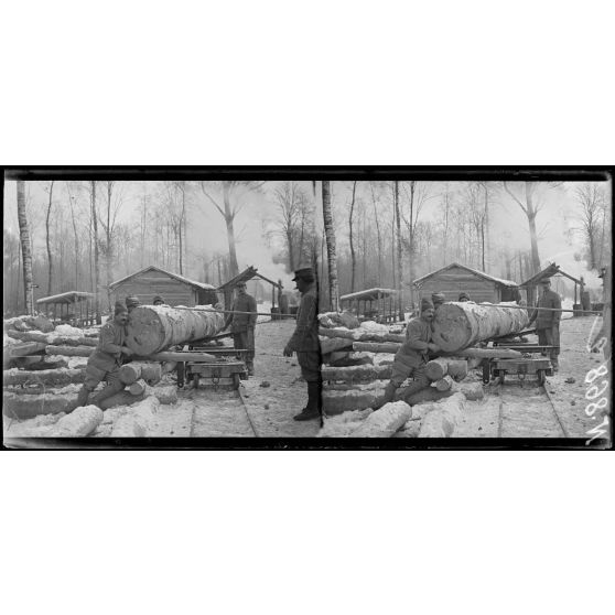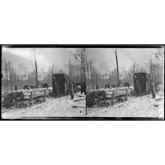 Près de Verrières (Marne). Exploitation forestière de la Haie Guérin. Chargement de rondins sur wagonnets.