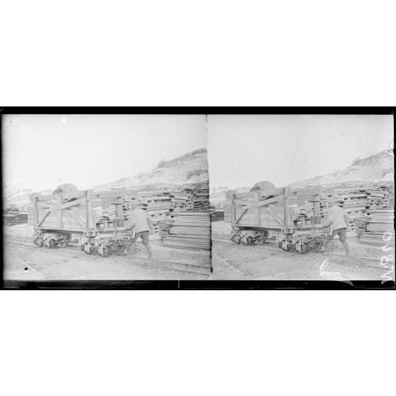 - Près de Beauséjour, panorama de la position du ravin de Marson. Des troncs d'arbre sont enlevés par les wagons de Decauville.