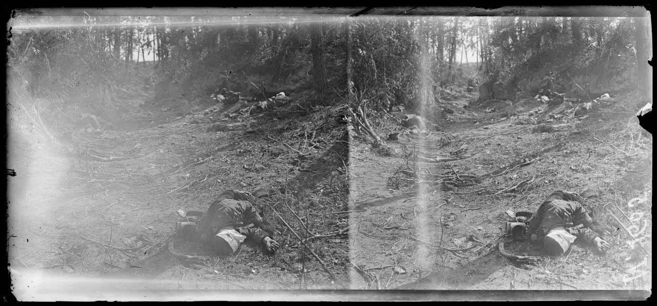 Vers Longpont (ferme de Beaurepaire). Terrain conquis par la 38e DI, régiment d'infanterie coloniale du Maroc. Cadavres allemands.
