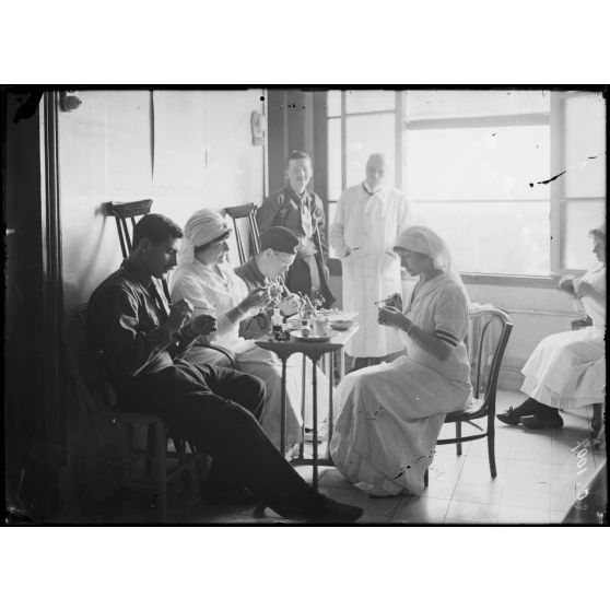 Hôpital Complémentaire du Val-de-Grâce n°11. 57 Boulevard de Montmorency. Paris (dénommé aussi Ambulance Italienne). Petite scène dans l'atelier de peinture.